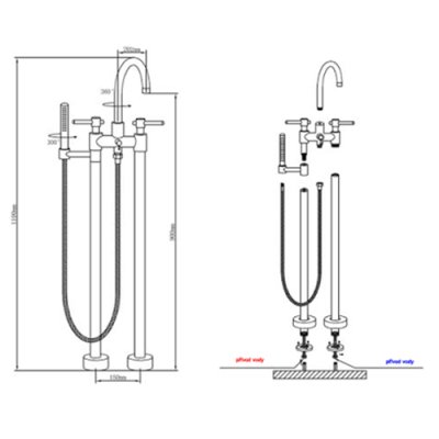 Baterie vanová volně stojící sloupová s ruční sprchouHmotnost: 25kgCelková výška baterie včetně podstavce a ruční sprchy je 1100mmVýška baterie včetně podstavce po výtokové rameno je 90cmDélka výtokového ramene od středu baterie po střed výtoku je 202mm.Baterie je opatřena ze spodní strany základen packami pro uchycení k podlaze za pomocí hmoždinek.Součástí balení jsou připojovací nerezové hadice na teplou a studenou vodu.Rozteč baterie je 150mmSprchová hadice má délku 1500mm