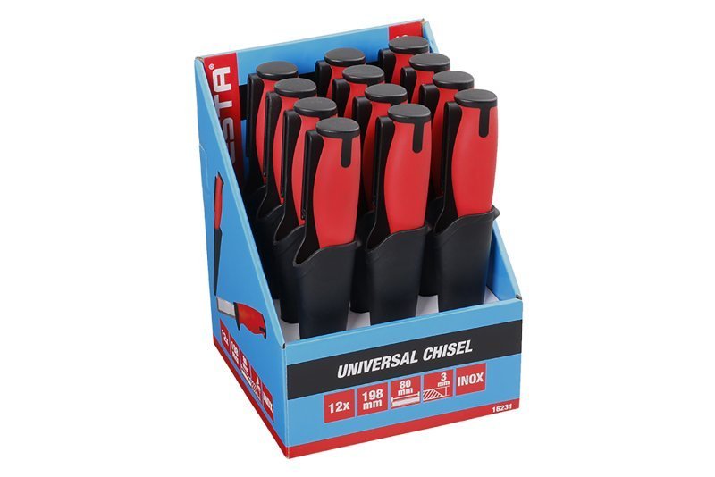 truhlářské multifunkční dláto FESTA s dvoustranným ostřím kvalitní nerezová zesílená čepel 3 mm, šířka 22 mm, délka 80 mm, celková délka 200 mm čepel odolná vůči úderům kladiva dvoukomponentní ergonomická rukojeť bezpečné pozdro s klipem pro řezbářské, truhlářské práce prodejní prezentační box 12 kusů