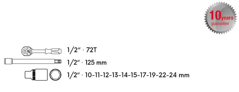 12 ks gola sada s ráčnou 1/2 v přehledném organizéru. Všechny části jsou vyrobeny z vysoce kvalitní chrom-vanadiové oceli, ráčny mají jemné dělení 72 zubů s přepínací páčkou a uvolňovacím tlačítkem, tělo ráčny z CrV oceli, zubový mechanismus z S2 oceli. Ergonomicky tvarovaná rukojeť se zdravotně nezávadnou gumou. 10 let záruka. Pro použití v průmyslu a servisech.