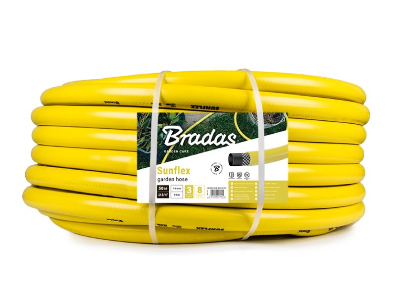 SUNFLEX - 3-vrstvá vyztužená zahradní hadice. Vyrobeno z měkčeného PVC. I vrstva - vnitřní vrstva černé PVC, odolné proti UV záření a anti-řas II vrstva - vyztužení pomocí syntetických vláken III vrstva - vnější vrstva, žlutá, vyrobená z měkčeného PVCTlak - max.8 barZáruka 8 let.