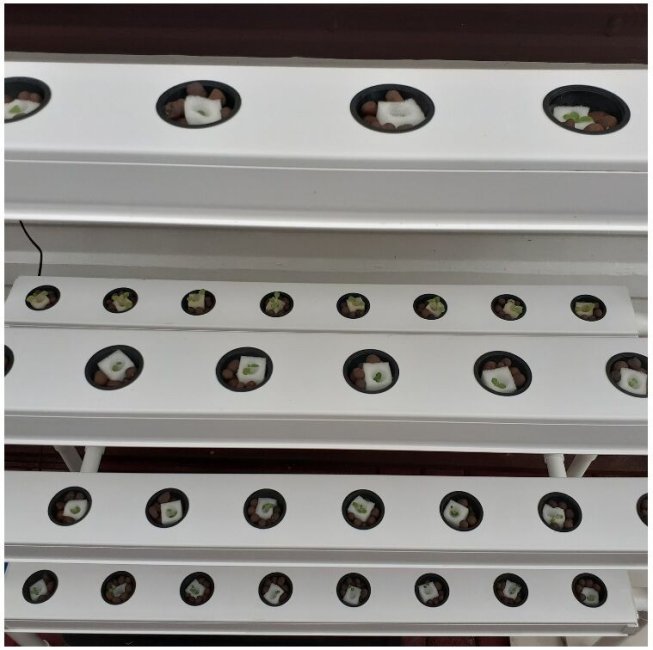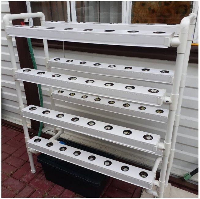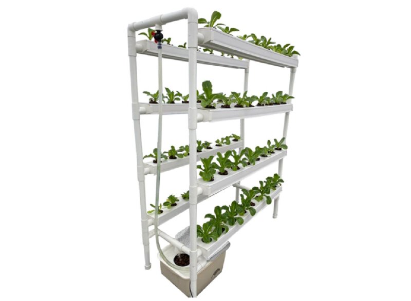 Kompletní hydroponický systém, stojan s 64 otvory pro pěstování rostlin.