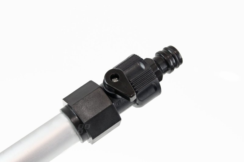 Tyč má pěnové rukojeti, rychlospojku pro připojení vodní hadice a průtokový ventil vody.