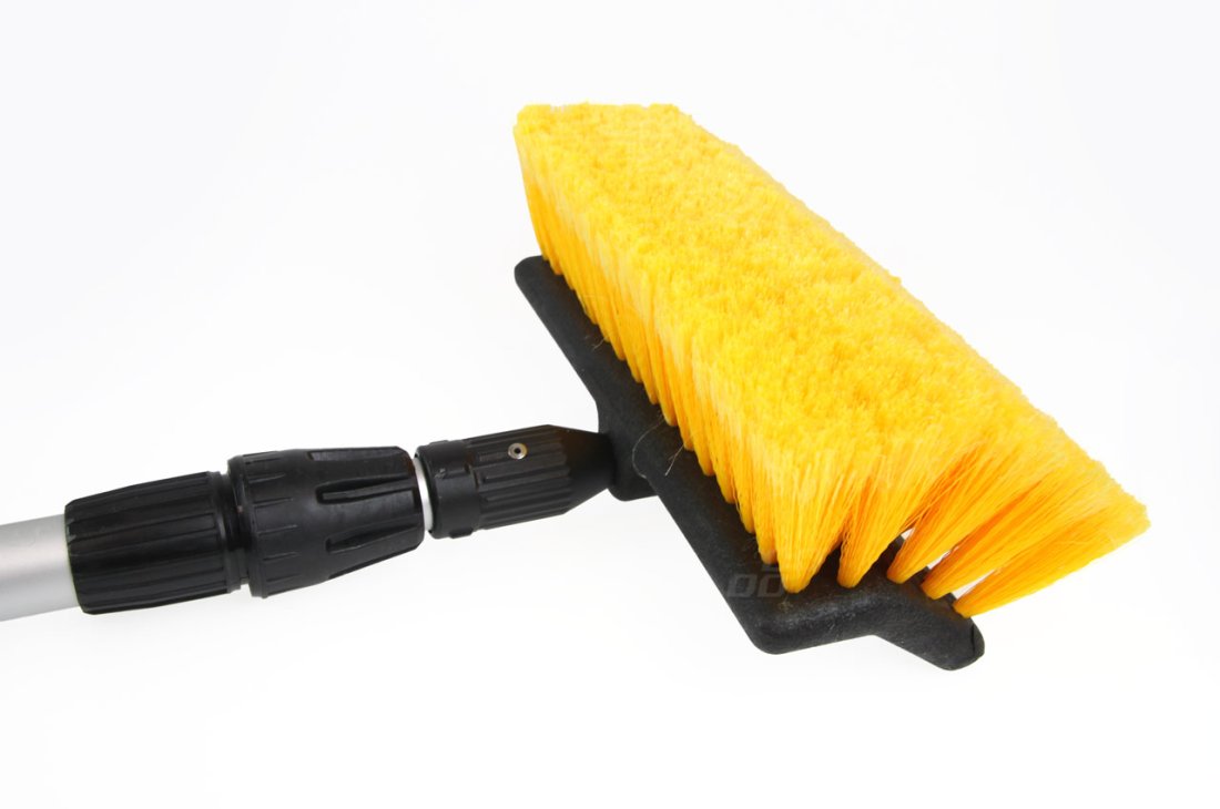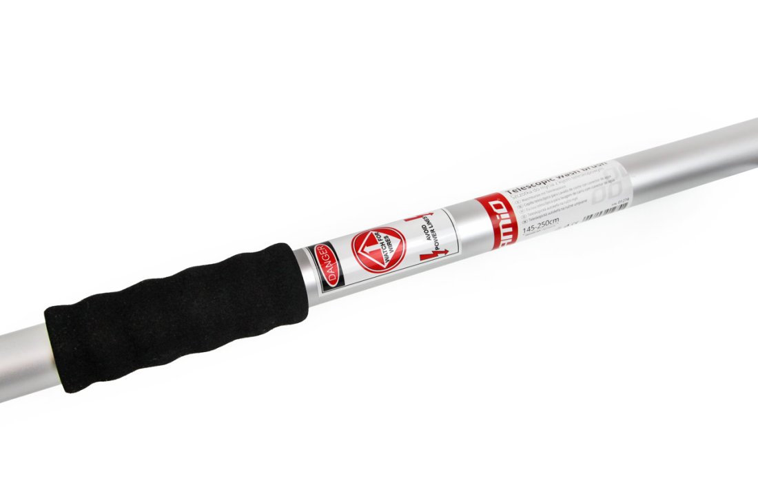 Pevný teleskopický kartáč s hliníkovou rukojetí, délkově nastavitelný od 145 do 250 cm.