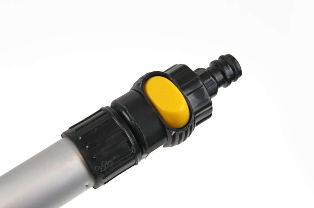 Hřídel má pěnová madla, rychlospojku pro připojení vodní hadice a vodní průtokový ventil.
