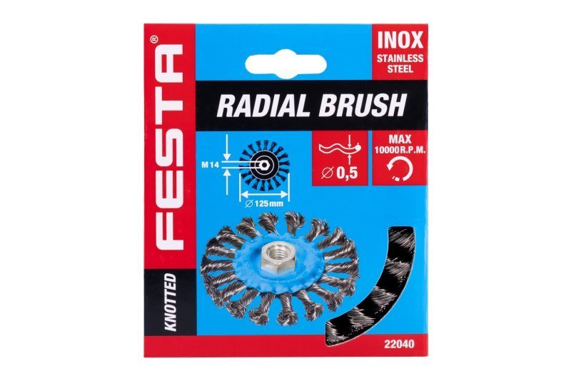 Rotační kartáč - radiální, provedení : COPY - patentovaný drát nerezová ocel 0,5 mm - copy, se ani při extrémním zatížení nerozplétají, kartáče FESTA zaručují kvalitní použité materiály i zpracování, průměr 125 mm, závit M 14 x 2 mm, pozinkované tělo kartáče, počet drátů : 1320, délka drátu : 27 mm, max. přípustné otáčky : 10000 1/min, použití : odstranění barvy, rzi, otřepů, zbytků po svařovení, strusky, zdrsňování, čištění kovoých součástí, balení papírový box s eurootvorem. Instruktážní video