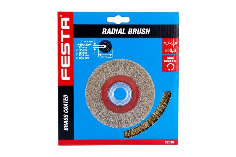 Rotační kartáč - okružní, provedení : vlnitý drát, kartáče FESTA zaručují kvalitní použité materiály i zpracování, drát 0,3 mm - pomosazený, průměr 175 mm, uchycení otvor 32mm (včetně redukčních kroužků 12,7mm - 1/2, 15,8 mm - 5/8, 19 mm - 3/4, 22,2 mm a 25,4 mm - 1), počet drátů 7200, délka drátů 41mm, maximální otáčky za min. 6000, vhodný pro zámečnické a kovoobráběcí práce, odstraňování rzi, barev, leštění.…, balení : papírový box.