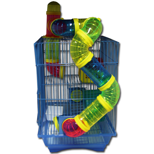 Krásná moderní dvoupatrová klec pro křečky, myši a malé hlodavce se spoustou zábavy. Kompletně vybavená klec s kolotočem, krmítkem, nechybí domeček, rozhledna a různé schůdky a potrubí.