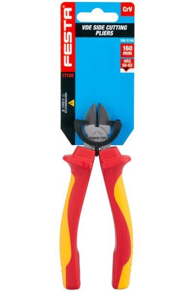 Kleště VDE boční štípací 160 mm FESTA mají certifikaci elektro VDE 1000 V, IEC/EN 60900-2004, kombinace polypropylenu a pryže na ergonomicky tvarovaných ručkách zaručuje výborné antiskluzové vlastnosti a dobrou odolnost vůči mazadlům a chemikáliím. Uchopovací čelisti obzvláště odolné proti opotřebení, chromvanadová vysoce výkonná ocel. Hmotnost 0,283 kg.