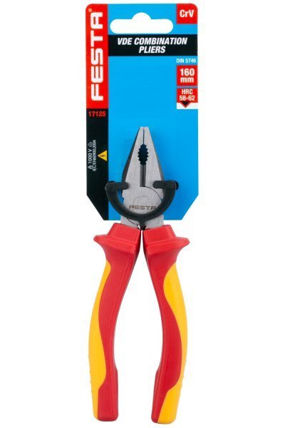 Kleště VDE kombinované 160 mm FESTA mají certifikaci elektro VDE 1000 V, IEC/EN 60900-2004, kombinace polypropylenu a pryže na ergonomicky tvarovaných ručkách zaručuje výborné antiskluzové vlastnosti a dobrou odolnost vůči mazadlům a chemikáliím. Uchopovací čelisti obzvláště odolné proti opotřebení, chromvanadová vysoce výkonná ocel. Hmotnost 0,283 kg.