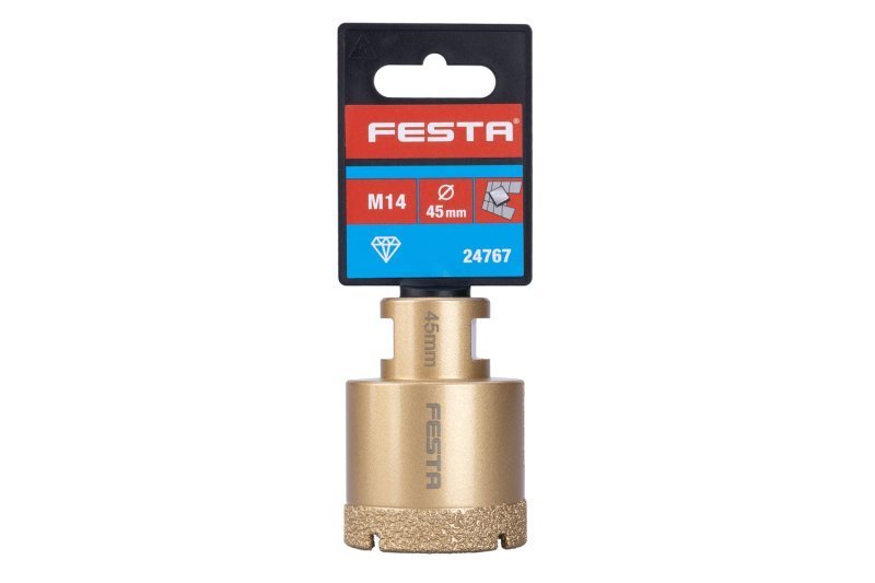 profesionální vykružovací diamantová korunka se závitem M14 - pro úhlové brusky pro "suché" přesné a rychlé vrtání do kamene, dlažby, obkladů, žuly, mramoru a jiných extrémně tvrdých materiálů nejen ve stavebnictví výška vrstvy diamantu 10 mm, dlouhá životnost bez nutnosti použít jakýkoli pomocný nástroj vykroužíte přesný otvor na požadovaném místě doporučený pracovní postup - našroubujte korunku přímo na závit hlavy úhlové brusky, pevně dotáhněte, vykružovat požadovaný otvor začněte pod úhlem 45 °, korunka a rychlost brusky okamžitě zajistí uchycení v požadovaném místě, pomalu při rovnoměrně vytvořeném tlaku narovnejte směr vykružování do svislé polohy, menší průměry 6 - 14 cm je u vrtání do tvrdých dlažeb, mezi jednotlivými vrty, ZCHLADIT - stačí ponořit do sklenice s vodou nebo nechat v otáčkách ochladit vzduchem! Instruktážní video