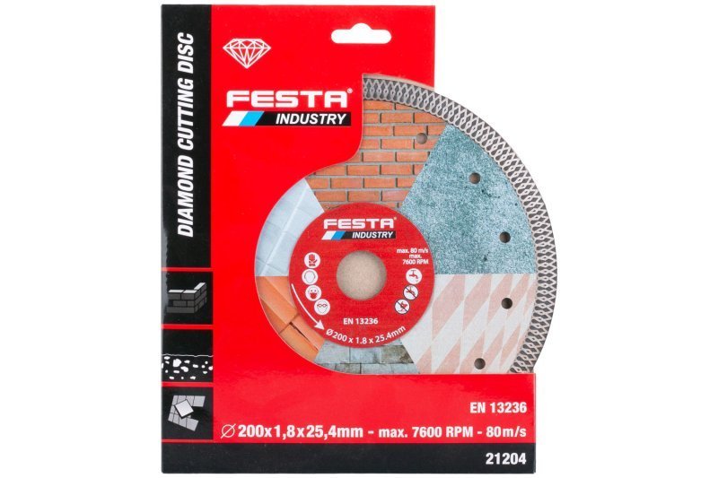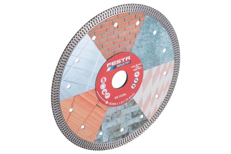 profesionální diamantový turbo kotouč FESTA INDUSTRY - extra tenký jen 2 mm kvalitní diamantová vrstva se speciálním tvarem segmentů a vysokým obsahem diamantového prachu -rychlé a přesné řezání, dlouhá životnost přesné zpracování - napojení na nosný disk kotouče odolávající vysokým teplotám, chladící otvory v těle kotouče pro maximální chlazení kotouče při práci, zesílený střed - vyšší pevnost konstrukce kotouče s nižším přenosem nežádoucích vibrací určený pro mokré i suché řezání dlažby, obkladů, keramiky, porcelánu, skla, betonu, cihel, zdiva, žuly, mramoru, kamene