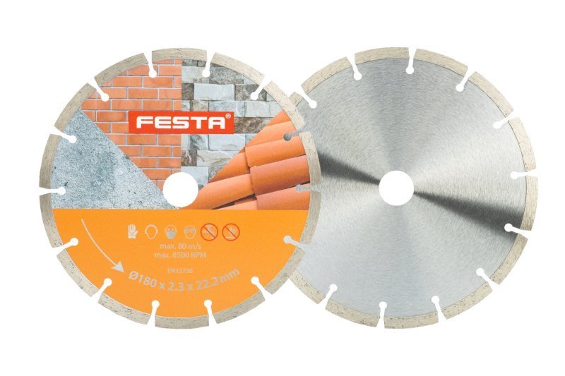 Profesionální diamantový kotouč FESTA, provedení : SEGMENTOVÝ, kvalitní materiály i zpracování - vysoce pevné uchycení diamantových segmentů k nosnému disku kotouče, vysoký obsah diamantového prachu v segmentech, použití : pro suché řezání betonu, cihel, zdiva, kamene, ... , balení : blistr s eurootvorem, rozměry : uvedeny v názvu výrobku.