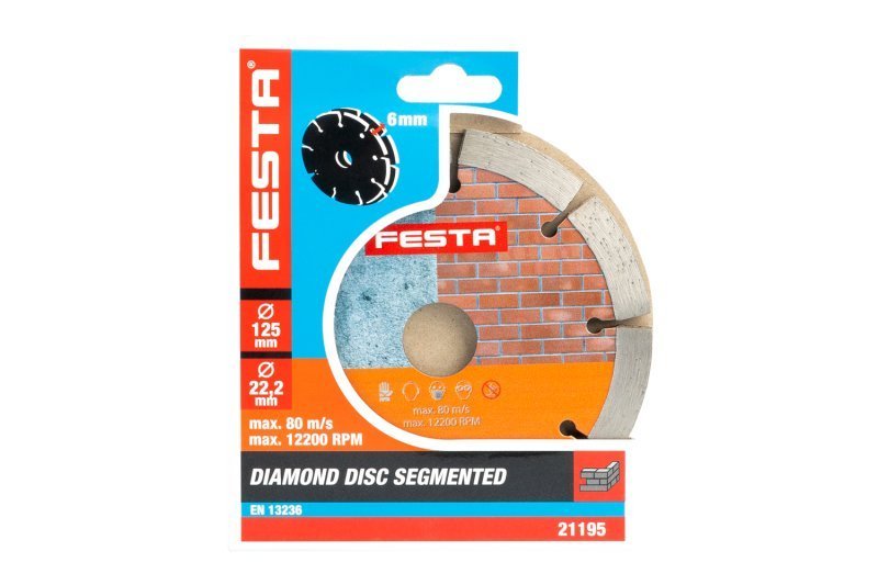 Dvojitý diamantový segmentový kotouč FESTA pro drážkování, 125 x 6 mm, průměr otvoru 22,2 mm, výhodou kotouče je, že lze upnout i do běžné úhlové brusky! Kvalitní diamantové segmenty s vysokým podílem diamantových zrn, segmenty přivařeny laserem k nosnému kotouči vyrobenému z vysoce kvalitní oceli. Díky použitým materiálům i zpracování, nabízí kotouč velmi dlouhou životnost! Použití - pro vyřezání drážek, oddělení stavebních materiálů, odstranění malty... Instruktážní video