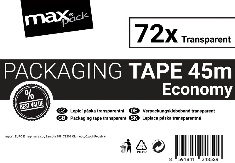 Maxpack univerzální lepící páska je nepostradatelným pomocníkem v každé domácnosti, kanceláři i skladu. Díky silné adhezi a kvalitnímu akrylovému lepidlu zajistí pevné a trvanlivé spojení na široké škále materiálů. Ideální pro balení zásilek, zpevňování kartonů i běžné opravy.