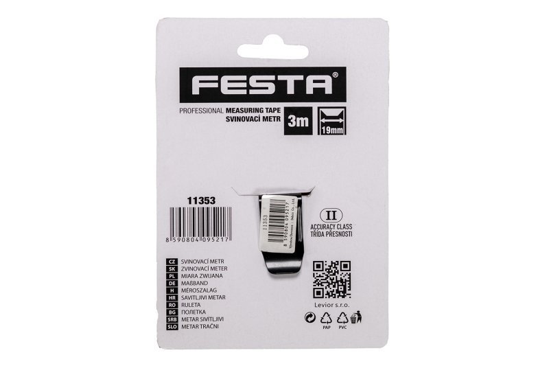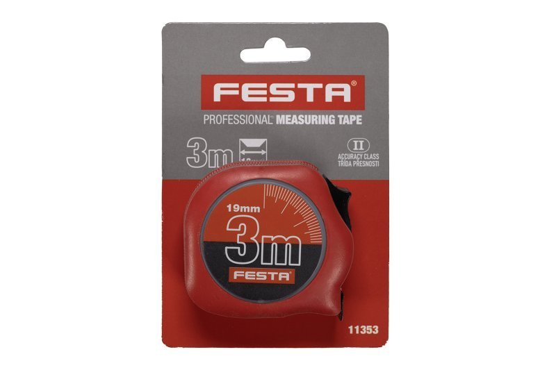 metr svinovací 3 m x 19mm II. třída přesnosti otěruvzdorná nylonová vrstva - ochrana pásky kalená páska, tělo z ABS plastu a TPE gumy, "satin finish" háček s plovoucím uchycením pro vnitřní i vnější měření klip na opasek, baleno na blistru