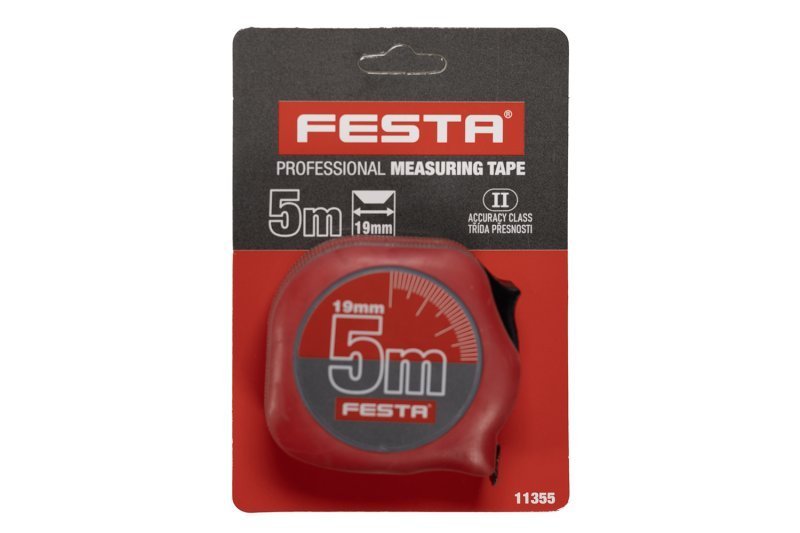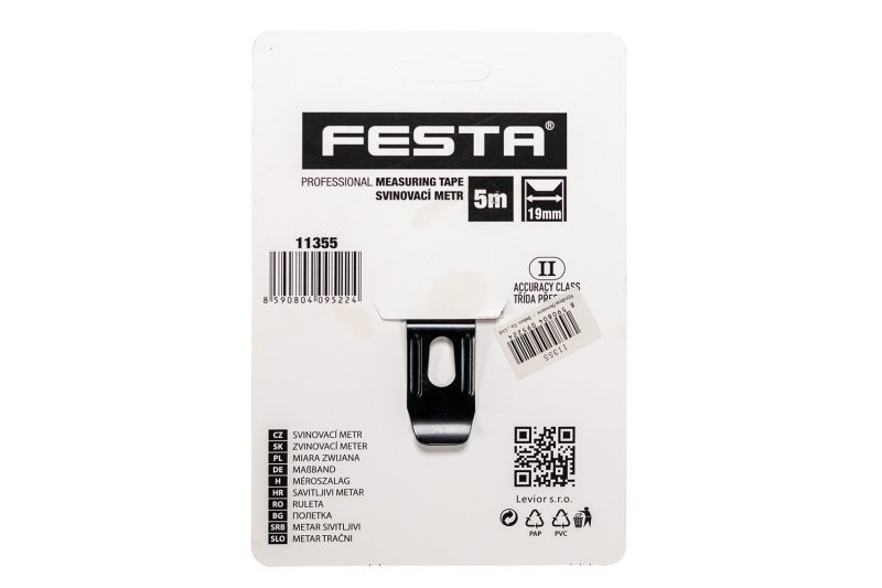 metr svinovací 5 m x 19 mm II. třída přesnosti otěruvzdorná nylonová vrstva - ochrana pásky kalená páska, tělo z ABS plastu a TPE gumy, "satin finish" háček s plovoucím uchycením pro vnitřní i vnější měření klip na opasek, baleno na blistru