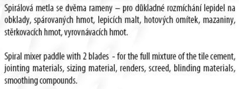 míchadlo - metla s prodlouženou spirálou pozinkované průměr 80 mm, délka 500 mm stopka - šestihran použití : rozmíchání lepidel na obklady, spárovacích hmot, lepících malt, hotových omítek, mazaniny, stěrkovacích hmot, vyrovnávacích hmot, atd.