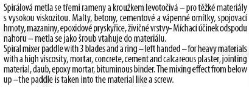 Míchadlo - pravotočivé (míchací účinek odspodu nahoru) - metla, pozinkované, rozměr: M14 120 x 600 mm - M14, použití : pro těžké materiály s vysokou viskozitou, malty, betony, cementové a vápenné omítky, spojovací hmoty, mazaniny, epoxidové pryskyřice, živičné vrstvy.