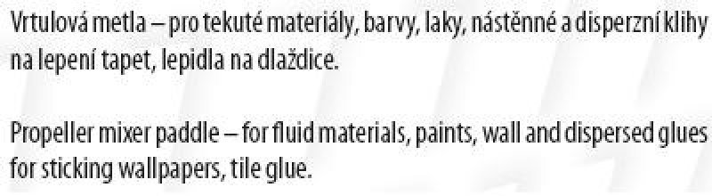 míchadlo - metla vrtule pozinkované průměr 80 mm, délka 500 mm stopka - šestihran použití : pro tekuté materiály, barvy, laky, nástěnné a disperzní klihy na lepení tapet, lepidla na dlaždice, tvar lopatek je uspůsobený tak, aby došlo k dokonslému míchání směsi bez nežádoucího znečištění