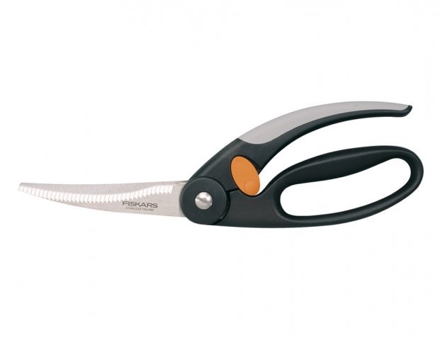 Silné nůžky jsou vhodné na porcování drůbeže a zvěřiny. Zahnuté čepele usnadňují stříhání a zoubky na čepeli snadno pronikají kostmi. Komfortní ergonomická držadla jsou vhodná pro praváky i leváky. Mají nastavitelný přítlak čepelí a speciální otvor pro snadné odšroubování víček PET lahví. Výška: 250 mm, délka: 20 mm, šířka: 85 mm, hmotnost: 111 g.