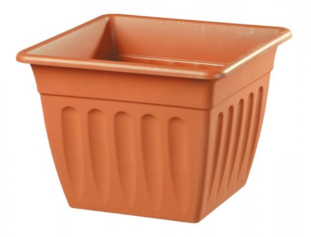 Plastový květník čtvercového půdsorysu v barvě terakoty s vlisovanými obrácenými kapkami, vystouplejším horním límcem zakončeným ohnutím ven. Šířka: 38 cm, výška: 28 cm, hloubka: 38 cm.