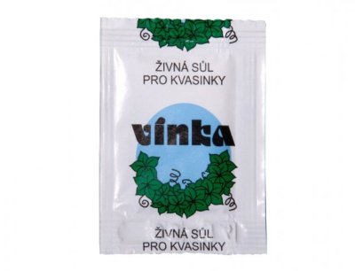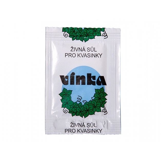Živná sůl pro kvasinky. Obsah 1 sáčku živné soli Vinka stačí pro dodání živin pro dostatečný nárůst kvasinek pro kvašení 10-ti litrů.