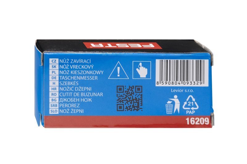Malý kapesní nůž FESTA, kompatní rozměry, kvalitní čepel i zpracování, ostří zajištěno pojistkou proti zavření, karabina v rukojeti pro zavěšení na klíče, řetizek, atd., v čepeli výsek použitelný jako otvírák na lahve. Baleno v krabičce.
