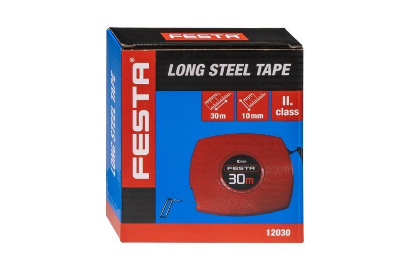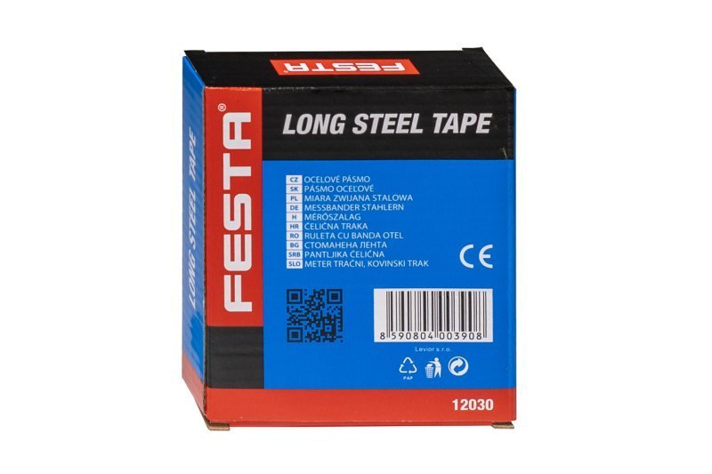 Kvalitní a přesné ocelové pásmo, kalená páska s očkem, CE certifikát - vhodné ke kalibraci, sklopná navíjecí ručka, poutko.