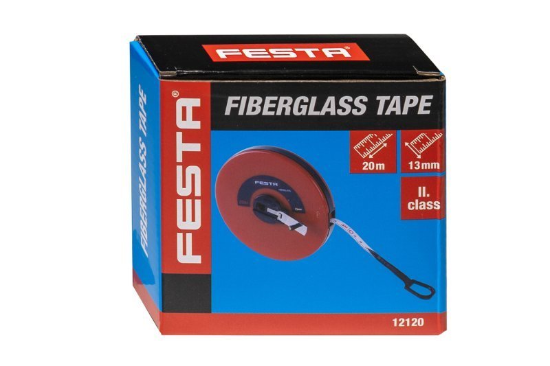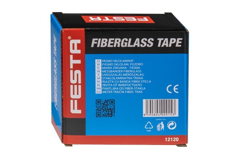 Kvalitní a přesné sklolaminátové pásmo, páska zakončená očkem s gumovou ochranou proti vytrhnutí, CE certifikát - vhodné ke kalibraci, sklopná navíjecí ručka, poutko.