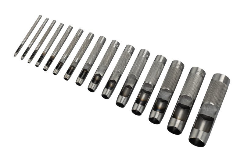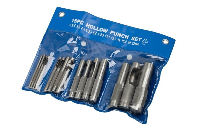 Ocelové děrovače na kůži. Děrovače jsou opatřeny bočním výhozem odpadu. Sada 15ks. Průměry děrovačů: 2mm, 2,5mm, 3,2mm, 4mm, 4,8mm, 5mm, 6,4mm, 8mm, 9,5mm, 11,1mm, 12,7mm, 14mm, 15,8mm, 19mm, 22mm.