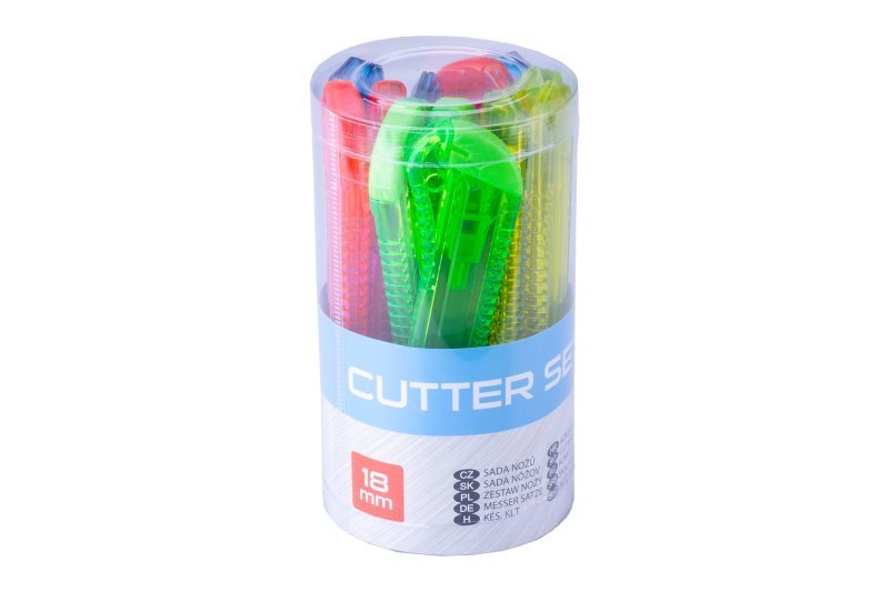 Sada plastových odlamovacích nožů 18mm, 12ksů, plastová kruhová dóza, barevný mix.