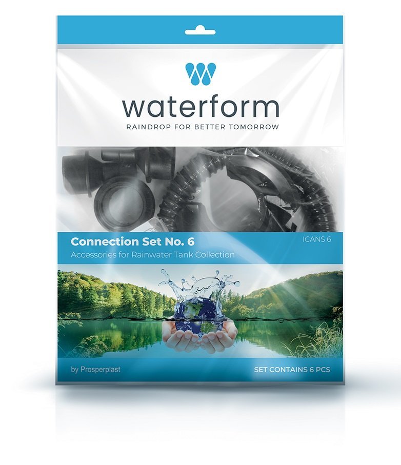 ICANS6 - Spojovací systém určený ke sběru a přenosu dešťové vody do sudu. Sada obsahuje 6 dílů: vykružovadlo; 3 redukce; zahradní hadici; lapač vody. Všestranný produkt, jeho jednoduchá konstrukce zajišťuje rychlou instalaci a snadný přístup bez velkého zásahu do svodu okapu.