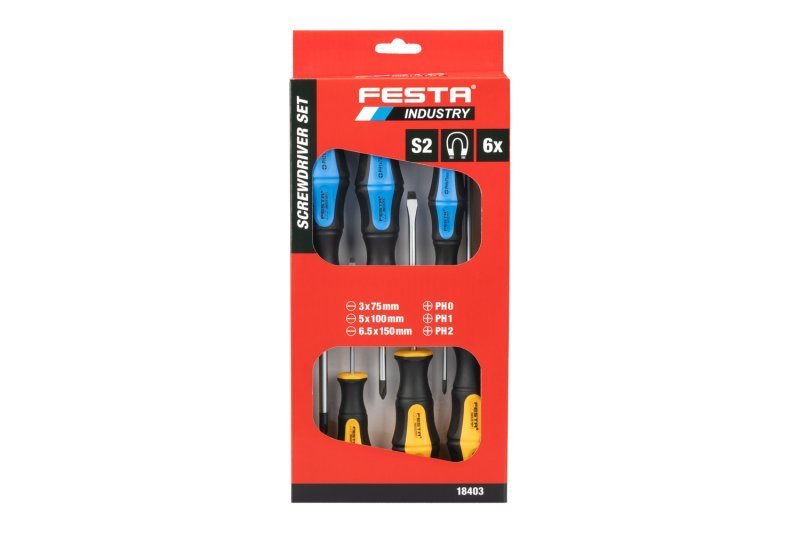 profesionální šroubováky určené pro průmyslové použití dřík vyroben z oceli S2 - ocel zušlechtěná legovacími prvky - chrom, křemík, mangan, molybden, vanadium magnetická kalená špička ergonomická zdravotně nezávadná dvoukomponentní rukojeť - neklouzavý a pohodlný úchop, otvor pro páku obsah sady - ploché 3x75, 5x100, 6x150 - PH 0, 1, 2 typ a rozměry uvedeny v názvu výrobku
