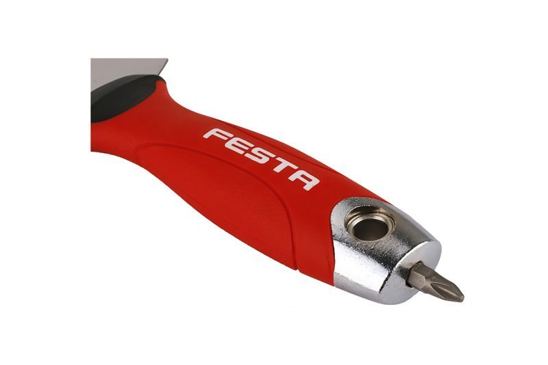 Špachtle s bitem nerezová FESTA 150 mm je vyrobena z vysoce kvalitní nerez oceli, rukojeť je ergonomický tvarovaná a pogumovaná. Používá se ve stavebnictví, zejména pak sádrokartonářském oboru a to pro perfektní zakrytí spojů sádrokartonových desek. V horní části rukojeti je umístěna vložka Ph °2, která se používá v případě, kdy je třeba dotáhnout vyčnívající šrouby z povrchu.