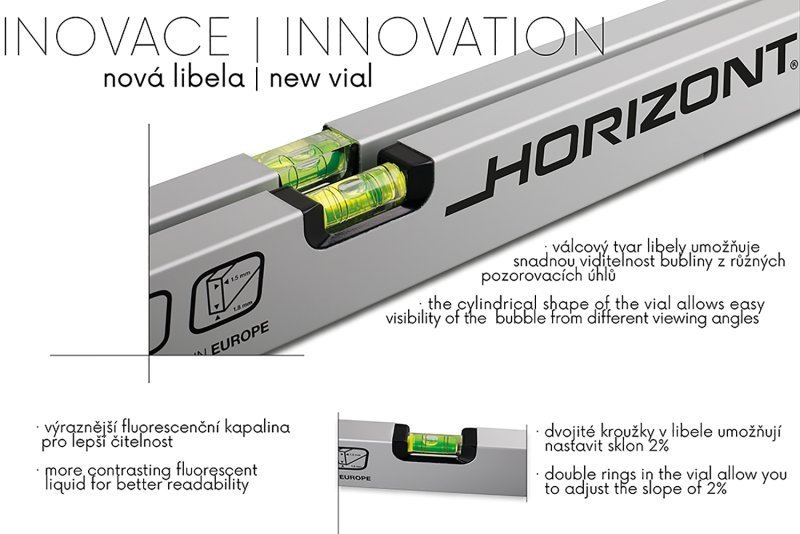 inovovaná horizontální válcová libela - snadná viditelnost ze všech úhlů pohledu dvojité kroužky v libele - vnější kroužky pro sklon 2% výraznější fluorescenční kapalina pro lepší viditelnost bubliny na slunci i v horších světelných podmínkách vodováha se dvěma libelami přesnost 0,5 mm/m = 0,0285° tloušťka stěny ALU profilu 1,5 mm, eloxovaný otěruvzdorný povrch vodováha je odolná proti provozním nárazům 10 let záruka na libely, KAŽDÝ KUS ELEKTRONICKY TESTOVÁN