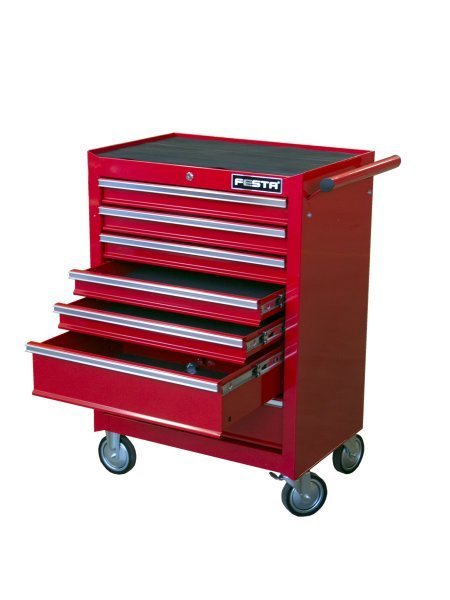 Vozík na nářadí FESTA z ocelové konstrukce a plechu, 7 zásuvek + samostatná odkládací přihrádka nahoře se zvednutým okrajem, posuvné zásuvky s kuličkovým ložiskem, zásuvky s protiskluzovými rohožemi, uzamykatelné pomocí centrálního zámku, praktická rukojet pro snadné ovládání. Vozík na nářadí je vybaven kovovými koly s pryžovou obručí, 2 otočná kola jsou opatřena nožní brzdou. 680 x 460 x 1020 mm.