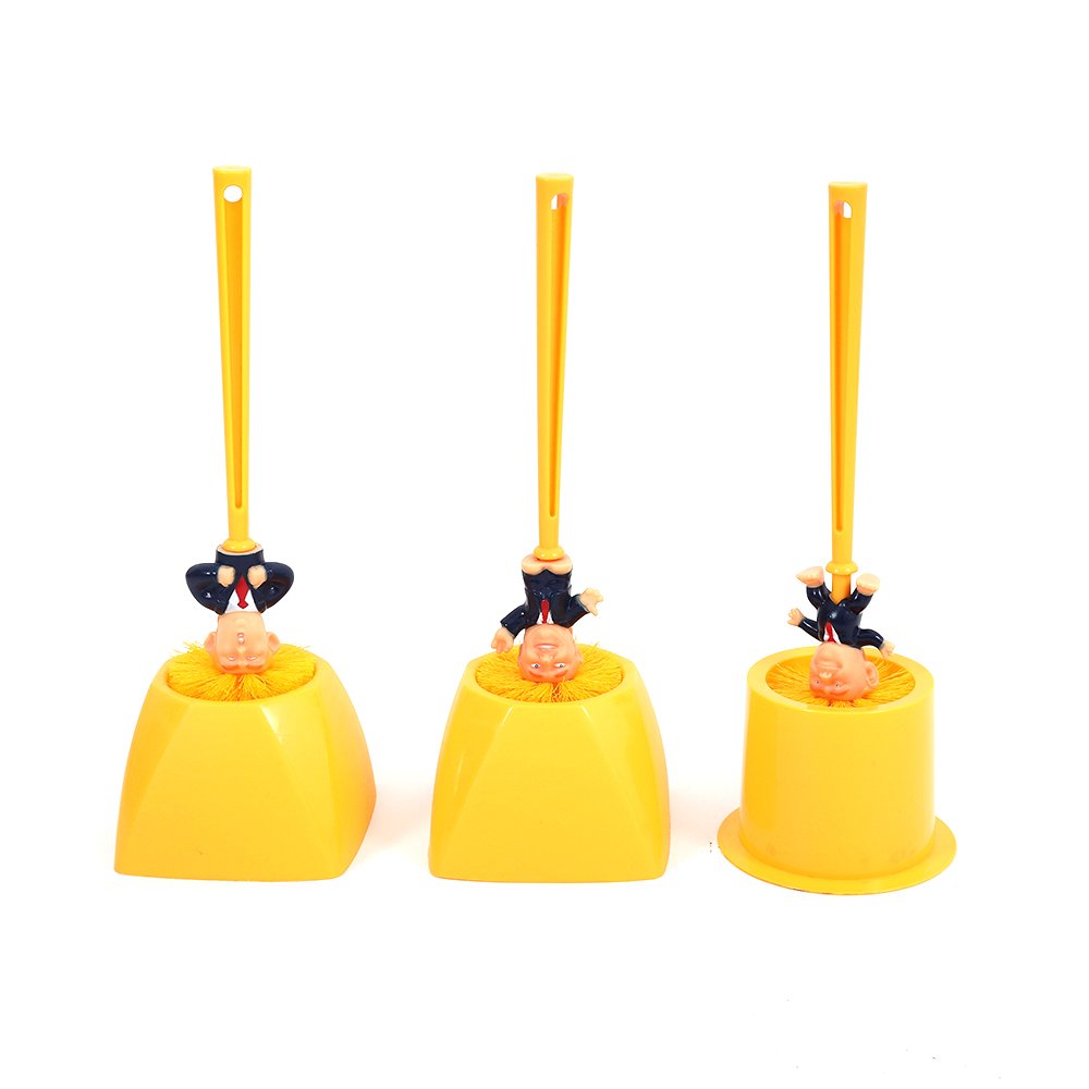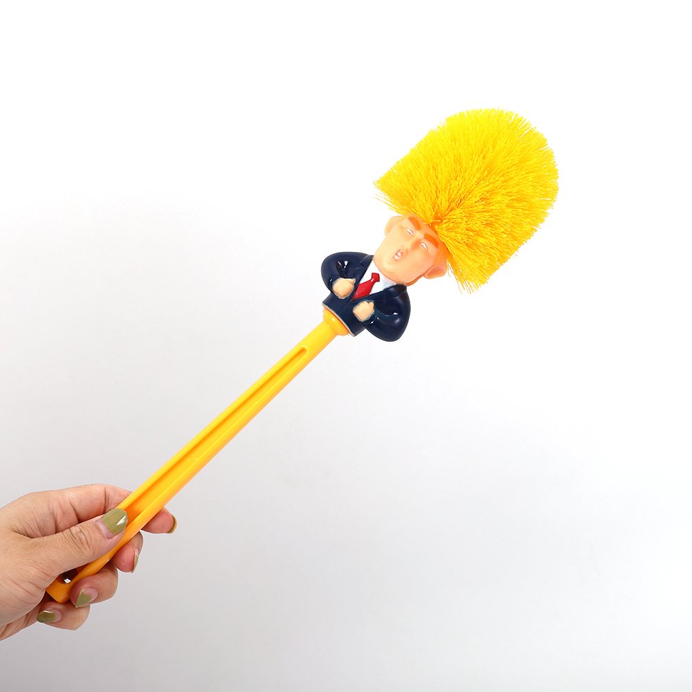 Wc štětka se stojánkem jsou plastové. S podobiznou Amerického presidenta Donalda Trumpa který nosí modrý oblek a červenou kravatu.