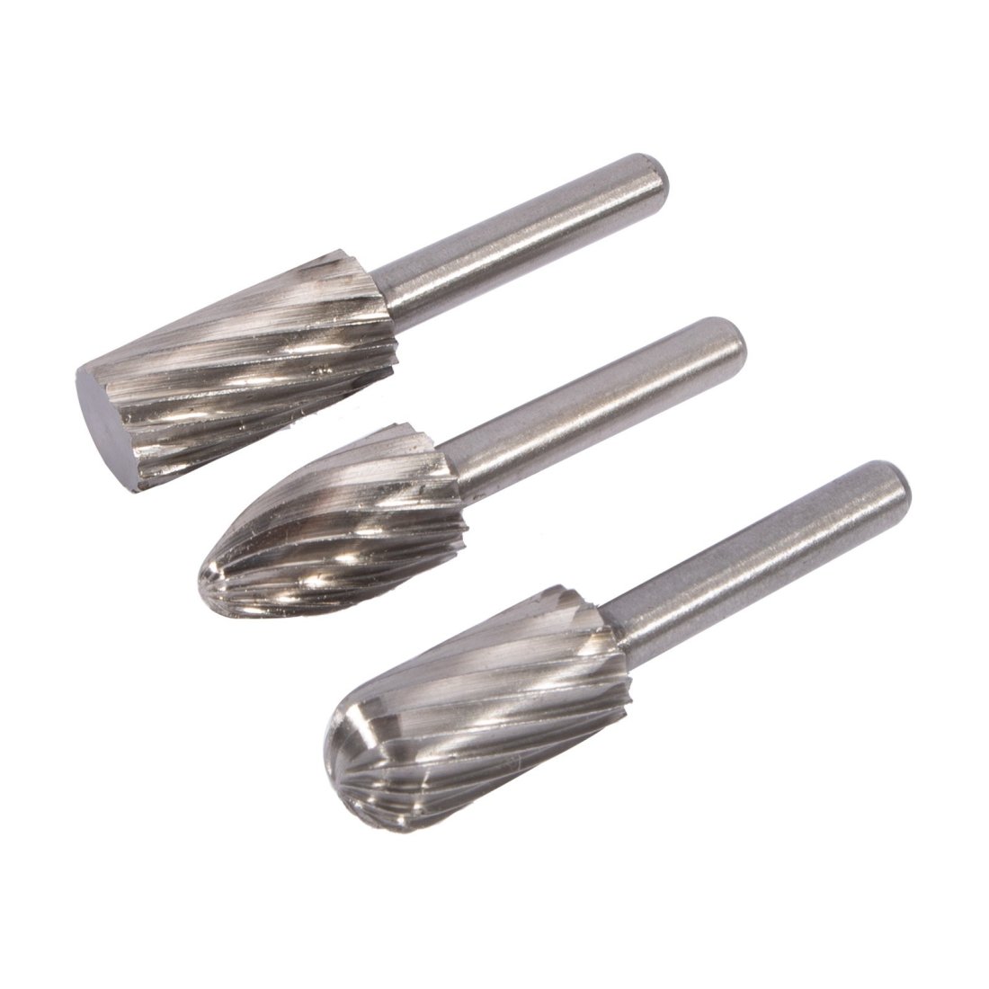 Třídílná sada kolíkových rotačních rašplí vhodných pro opracování dřeva, plastů nebo měkčích kovů. Upínání zajišťuje válcová stopka o průměru 1/4“ (6,35 mm).