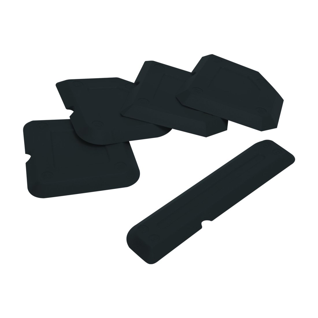 Pětidílná praktická sada plastových nástrojů na spárování a vyhlazování tmelu. Na výběr různé typy nástrojů s různými úhly, rádiusy a hranami. Vše uloženo v odolném plastovém boxu.