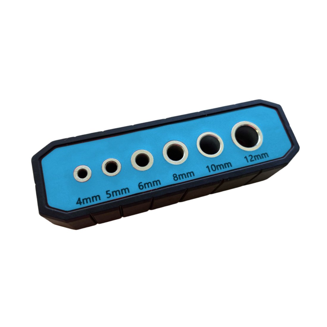 Praktický vodicí přípravek pro vrtání v různých průměrech (4–12 mm). Pogumovaný povrch pro pevný úchop a přilnutí k obrobku. Boční drážky označují středy předznačených vrtacích otvorů a zajišťují přesnou práci. Drážka ve tvaru písmene „V“ na spodní straně přípravku zajišťuje pevné uchycení k rohům a kulatým obrobkům.