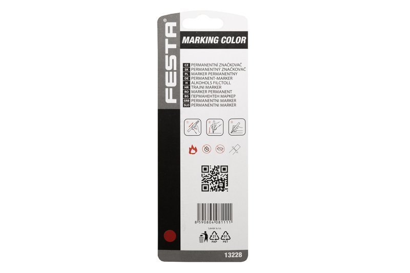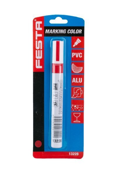 Speciální značkovací barva v hliníkovém pouzdře, síla hrotu 4 mm - červený, popisy železných konstrukcí, skla, plastů, černých strečových folií a tmavých podkladů, max.80°C.